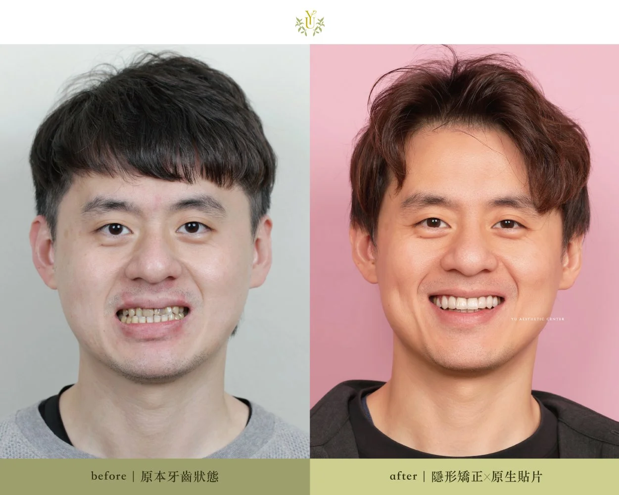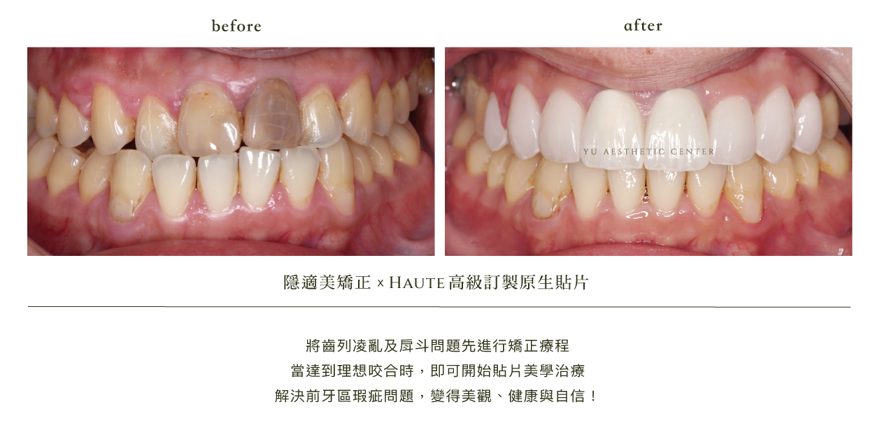 我們先以隱適美矯正調整他的咬合與牙齒位置,穩定咬合結構、改善戽斗問題;再透過 Haute 高級訂製原生貼片,重建前牙外觀,精緻雕琢牙齒比例、色澤與微笑曲線,打造出更符合他五官特質的自然笑容。